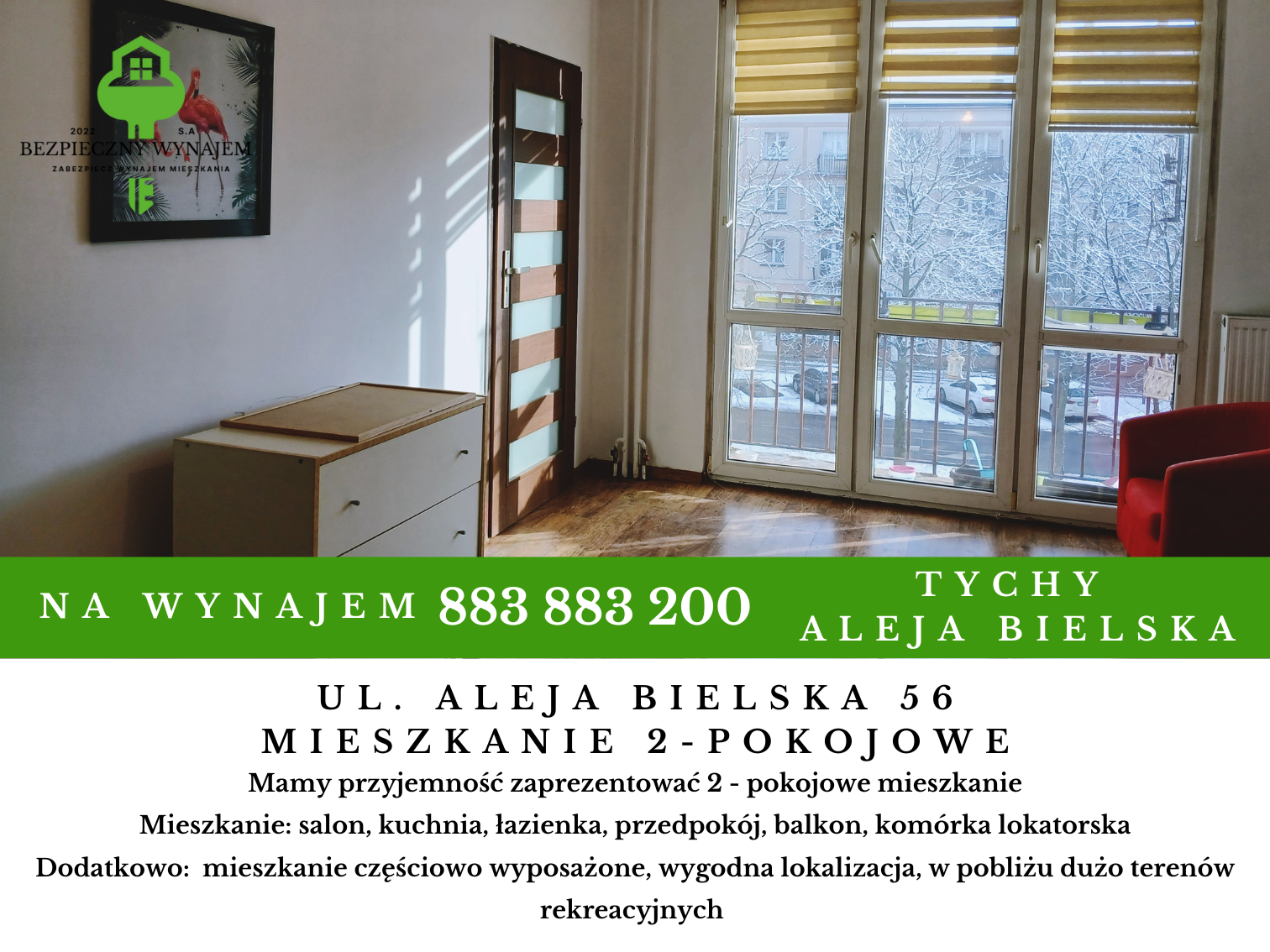 Mamy przyjemność zaprezentować Państwu 2 pokojowe mieszkanie zlokalizowane w Tychy przy ul Al. Bielska 56. Mieszkanie znajduję się na spokojnym osiedlu, w pobliżu mnóstwo terenów zielonych oraz Park Niedźwiadków w Tychach. Nieruchomość ma powierzchnie 37,0m2 i jest zlokalizowana na 2 piętrze, w budynku wielorodzinnym. Do mieszkania przypisane jest komórka lokatorska. Obok nieruchomości znajdują się miejsca postojowe ogólnodostępne. Mieszkanie dla ceniących sobie przytulną przestrzeń oraz spokojne otoczenie.